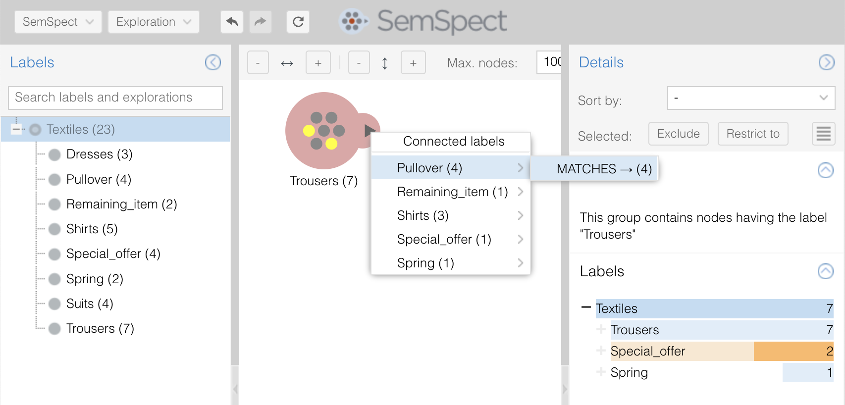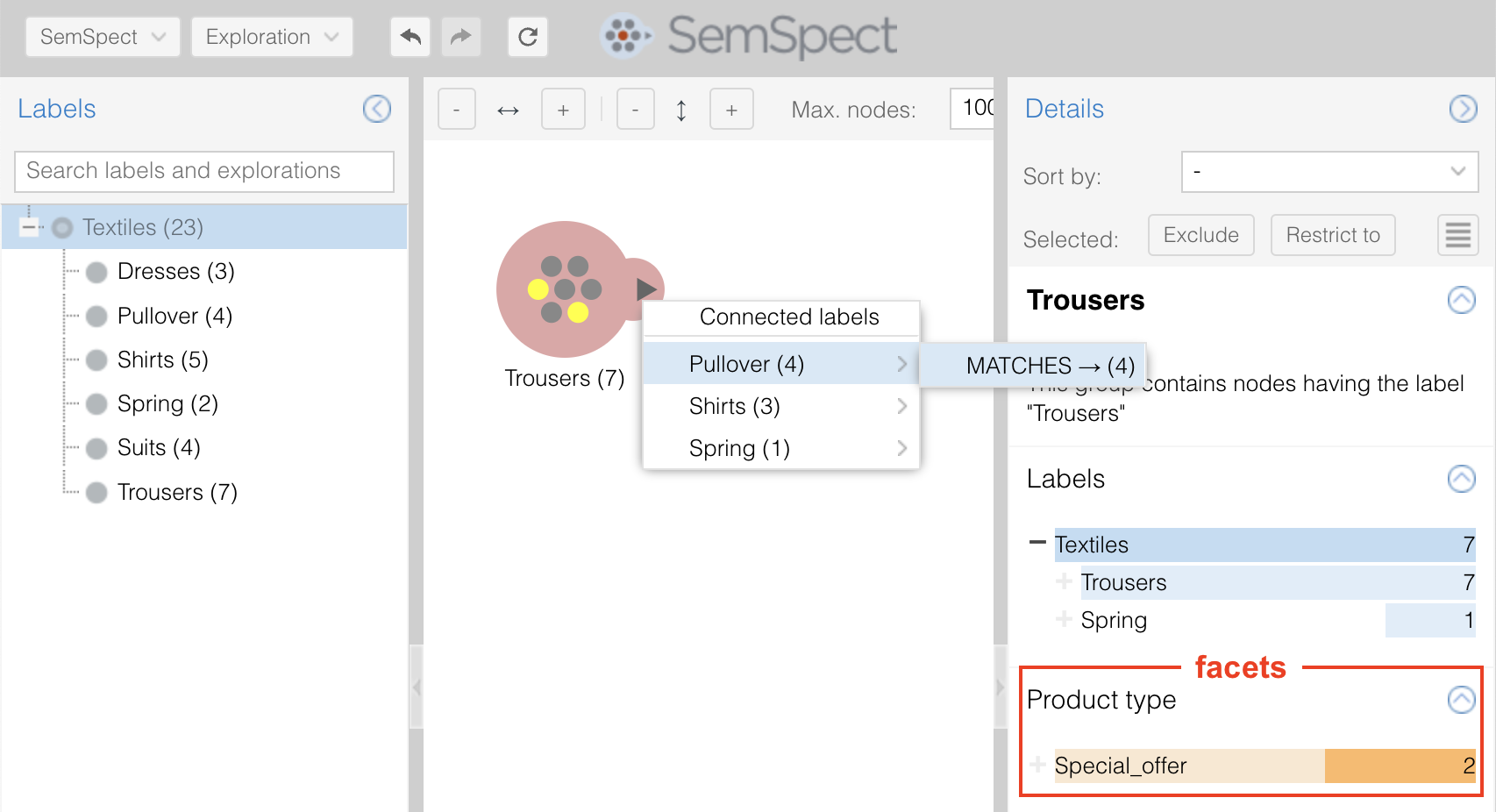 In case our main focus is on the type of clothing (shirt, trouser etc.) it might be useful to declare the sales information as a facet. This has the advantage that the label tree and exploration menu becomes shorter (facets are not shown in the label tree and exploration menu). However, the facet labels are still available for filtering on those groups that contain nodes with those labels: